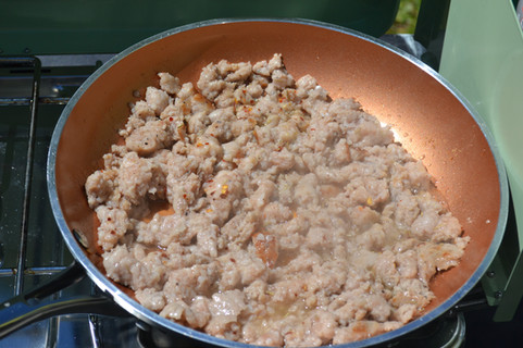 (Normally, if I am in a 'real' kitchen, I pull the sausage out of the pan after I cook it, then begin the gravy with the grease + butter in an empty pan and go from there but I have found that this method works just fine, especially for a smaller kitchen.)